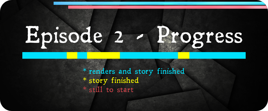 The first yellow block marks the final scene I still need to complete before the episode is done. And the last yellow block is the scene where I only need to finish the animations (so that one is actually mostly ready too).